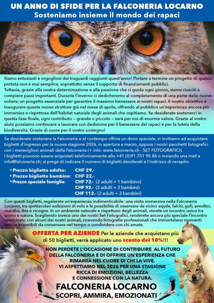 Venite a scoprire l’affascinante mondo dei rapaci alla Falconeria di Locarno, dove potrete osservare e fotografare da vicino, aquile, falchi, gufi ed avvoltoi, marabù, ibis e cicogne. Questi splendidi uccelli, con il loro volo libero, vi trasporteranno in una dimensione dove uomo e natura s’incontrano, in un contesto naturale e rispettoso degli animali.
