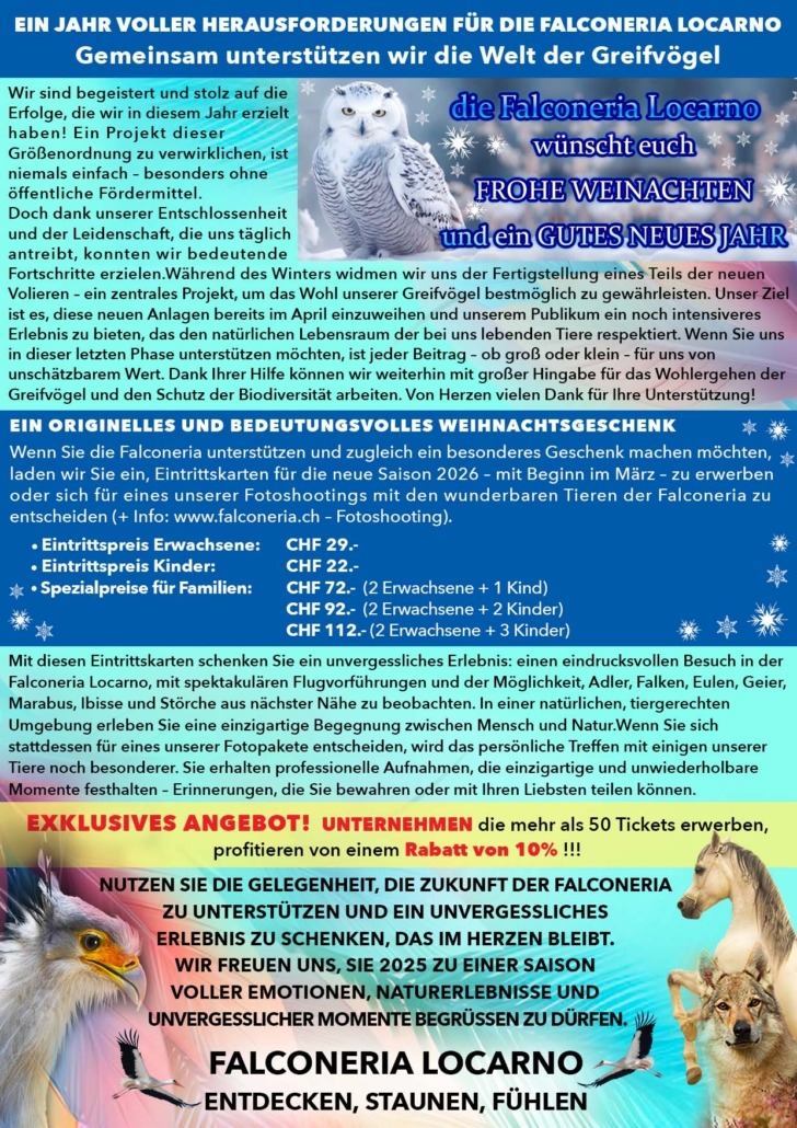Entdecken Sie die faszinierende Welt der Greifvögel in der Falconeria Locarno. Erleben Sie Falken, Adler, Eulen, Geier, Marabus, Waldrappen und Störche im freien Flug und aus nächster Nähe. Egal, ob Sie bobachten oder fotografieren möchten, in der natürlich gestalteten Falconeria bieten sich Ihnen beste Gelegenheiten. Lassen Sie sich von der Kraft und Eleganz dieser wunderbaren Vögel in eine andere Dimension entführen!